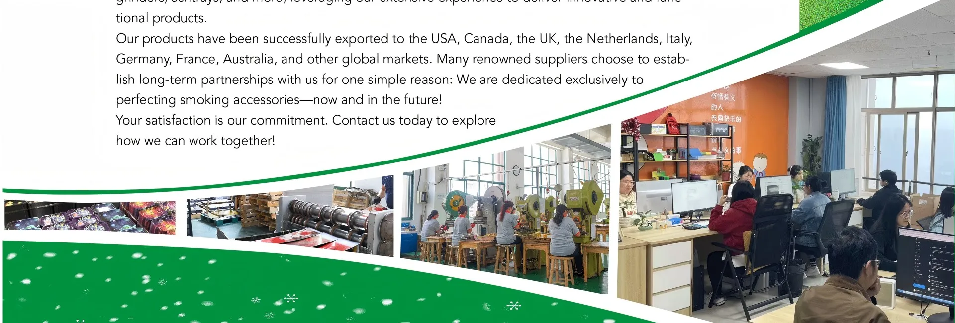 Основные продукты:Роликовый лоток, травяная шлифовальная машина, пепельница, набор для курения, аксессуары для курения
